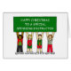 Vier Cartooncharaktere in der festlichen gemusterten Sportabnutzung, ein dunkelgrünes Zeichen halten, das "glückliches Weihnachten zu einem speziellen spinnenden Lehrer" sagt.