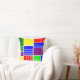 Dieses Kissen hat ein Bauhaus-Design von Rechtecken, unterteilt in immer kleinere Stücke in rot, gelb, blau, grün, lila auf einem Feld von weiß.