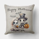 Dieses Halloween-Kopfkissen zeigt eine spukhafte und niedliche, gotische Cartoon-Dekoration. Ein Bild eines Jungenskeletts mit einem Oberhut und einer Anzug-Jacke sowie eine kleine Porzellanpuppe für Geistermädchen sind unten abgebildet. Zwei niedliche Fledermäuse fliegen über ihren Köpfen, während sie ihren Jack oder ihre Laternen durch die Nacht tragen. Ein "Happy Halloween"-Gruß wird auf dem Kopfkissen in einem eleganten Script-Schriftart gedruckt. Der Hintergrund weist ein Schattenmuster auf.