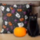 A cute hand drawn illustration of festive blend of ghosts and pumpkins on a black background, evoking a playful Halloween spirit.