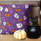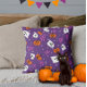 A cute hand drawn illustration of festive blend of ghosts and pumpkins on a vibrant purple background, evoking a playful Halloween spirit.