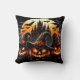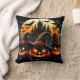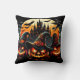 Drei aufwändig geschnitzte Kürbis leuchten hell und warmen Glanz vor dem Hintergrund einer dunklen, Spuk Burg und einer Hexe, die durch den Nachthimmel fliegt.
