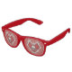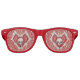 Diese Retro-Party-Brille hat eine sprichwörtliche rote Kontur mit weißen Knochen und einem Schädel in der Mitte auf einem roten Hintergrund mit weißem Linienmuster.