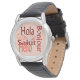Sag Hallo in fünf Sprachen mit einem coolen rötlichen Design. Diese Uhr ist perfekt für einen sportlichen Stil.