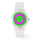 Moderne analoge Uhr in Grün und Magenta, weiße Zahlen mit schwarzem Schatten, sportlich rosa Band. Sie können auch ein weißes Band wählen. Diese Uhr ist 30 m wasserbeständig, ein stilvolles Kleiderzubehör oder eine harte, aber schicke Arbeitsuhr und behalte sogar die Zeit.