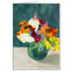 Eine Grußkarte mit einer Ool Pastellmalerei einer Blumendose aus Frühlingsblumen in einer dunkelgrünen Vase.