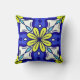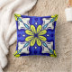 Square throw pillow with yellow flowers against a blue background.