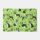 Niedliche St. Patrick's Boston Terrier in vielen Grüntönen mit gestreiften Pullover- und Herzklappen mit verstreuten vierblättrigen Kleeblattern und Hundeknochen auf grünem Hintergrund.