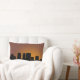 Eine Skyline einer großen Stadt, die gegen die aufgehende Sonne silhoutiert.