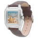 Eine Uhr mit einem niedlichen Foto eines Seesterns, aufrecht im Sand positioniert. Unter seinen Armen befinden sich 2 kleine Muscheln, die sich bequem ausruhen. Set an einem Strand mit Wellen im Hintergrund.