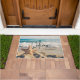 Begrüßen Sie die Tür mit einem landschaftlichen Foto. Ein großes Set aus Seestern direkt am Sandstrand. Ein schönes blaues Meer mit weißen Wellen im Hintergrund.