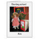 Start Schule haben viel Spaß Text mit wenig blonde Hair Puppe in Viktorianischen Stil Schule Uniform mit Blackboard und Blume