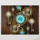 Türkisfarbene Linsen mit antiker Uhr mit Messinggetrieben und goldenen Tasten auf rostigem, braunem Hintergrund. Steampunkstil.