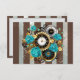 Gemusterte, antike Uhr mit Schmuck, goldene Stunden und lateinische Zahlen mit türkisfarbenen Rose auf braunem, gestreiften Hintergrund. Steampunkstil.