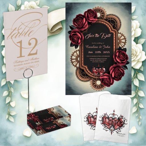Steampunk Rahmen mit Rote Rosen und Gängen - Vintage Liebe Typografie Design. Dieses einzigartige Design verbindet steampunk-Ästhetik mit romantischen Details. Ein dunkelgrauer Rahmen mit Bronzegetrieben und Nieten ist mit lebhaften rote Rosen und tiefgrünen Blätter geschmückt. Ganz unten erscheint das Wort "Liebe" in einem stilisierten Schriftart mit Herzakzenten, der eine auffallende Fusion von Industrie- und Blumenmotiven schafft. Ideal für Steampunkfans, Vintage Kunstliebhaber und alle, die die Mischung aus Romantik und mechanischem Charme schätzen.