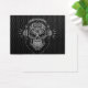 Ein aufwändiges DJ-Design mit Zuckerschädeln, das mit aufwändigen Wirbel und Punktmuster dekoriert ist. Kopfhörer sitzen oben auf dem Schädel und zwei Drähte hängen darunter. Die komplexen Linien und Kreise sind massiv schwarz, während das Innere des Schädels mit Edelstahltexturen und Silberfarben beendet ist. Der Schädel sitzt auf einem Stahlgitter-Hintergrund, der dieses industrielle Muster vervollständigt. Dieser aggressive Tag der Toten inspiriert ist eine farbenfrohe Darstellung der DJ-Kultur.