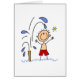 Ein Strichmännchenjunge steht unter dem Sprenger, um sich zu vergewissern, dass er cool an einem warmen Sommertag behält. Dieser niedliche Sommerentwurf kann mit einem Namen oder anderem Text personalisiert leicht sein.
