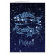 Karte mit dem Zodiaksymbol für Pisces in weichem silberblauem Blau, überlagert mit den Sternen der Sterne, vor einem Sternenhimmel, der von tiefer Mitternacht blau bis schwarz gestuft wird.