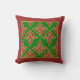 Stilvolles Kissen oder Streukissen mit traditionellem Fleur-de-lys-Muster in tiefrot und gold auf dunkelgrünem Hintergrund, mit einem breiten, roten Rahmen; aus einem digital bemalten Design von Judy Adamson.