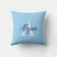Stilvolles Calm Blue Monogram Script Kopfkissen mit einer eleganten Namensgebung und Monogramm Initial auf hellblauem Hintergrund. Das Kissen lässt sich leicht personalisieren, indem man den Namen und das Monogramm des ersten Ihrer Wahl in die Online-Personalisierungsvorlage eintippt, bevor man bestellt. Der Text kopiert sich automatisch auf die andere Seite des Kissens, um auf jeder Seite den identischen Namen und die Initialangabe anzuzeigen.