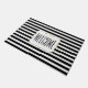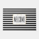 Chic Vordertür Matte in schwarz-weiß Streifen horizontal gestreift. Ein weißer, dekorativer Textbereich, in der Mitte der Matte, hat schwarzen Text, der auf Sie zugeschnitten werden kann. Was für eine schöne Art, Gäste auf Ihrem Zuhause willkommen zu heißen.
