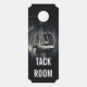 Ein Türhänger mit einem klassischen Schwarz-Weiß-Tonfoto aus Sepia. Ein Bild eines englischen Ledersattelsadels mit Silberrührwerk. Ideal für englische Reitbegeisterte.