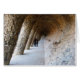 Ein Spaziergang, der von Steinsäulen und Mauern gesäumt ist, in Park Guell, Barcelona, Spanien.