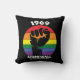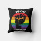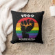 Gay Pride werfen Kissen Design trotzig Faust auf Regenbogen Hintergrund mit 1969 - NYC's Stonewall Aufruhr Gedenktext.