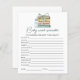 Wasserfarbe ein Stapel Bücher ist mit einem grünen Bogen verbunden. Ein neues Kapitel wird bald beginnen. Babyduschbücher, neues Kapitel. Antworten: KREISE, KREUZEN, SCHNULLER, FLASCHE, NACHTLICHT, LULLABY, STROLLER, EPIDURAL, BURP, HOCHSTUHL, DIAPER BAG, SCHWIMMBAD