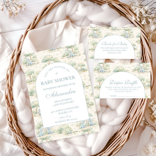 Welcome a little one with this charming storybook-inspired dinosaur design, featuring soft blue illustrations and a delicate vintage nursery feel. The playful dinosaur pattern paired with a clean arched layout creates a gentle and timeless look, perfect for a cozy and joyful baby shower. With its soft color palette and classic storybook aesthetic, this design feels warm, inviting, and effortlessly adorable—ideal for celebrating a baby boy or a whimsical dino-themed event.