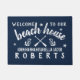 " Willkommen zu unserem Strandhaus" Text mit Kanupaddeln, Ankern, Starfish und Ihrem Familiennamen - dunkler Marineblau-Imitatleinwandhintergrund mit Weiß