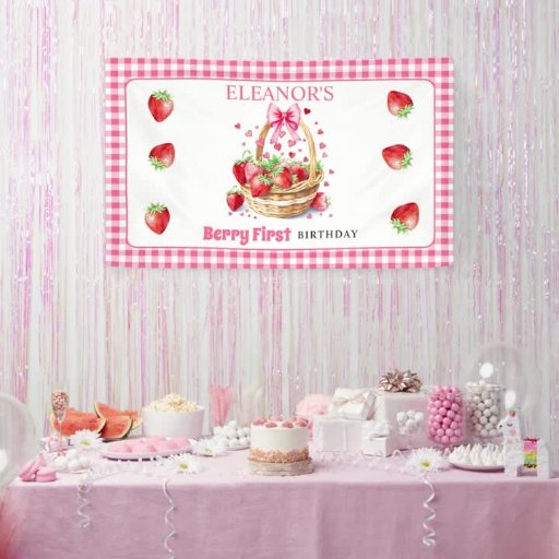 Basket with strawberries, hearts and pink bow Berry First Birthday Thank you card. Celebrate your "Berry First Birthday" with this adorable photo Thank You card. Its sweet design centers on an overflowing basket filled with vibrant red strawberries, accented by whimsical hearts and a delicate pink bow. The playful "Thank You Berry Much" text is artfully placedalong with your personalized message. A classic hot pink gingham frame these elements, creating a charming, picnic-ready aesthetic. The back of the card features an additional photo of your baby, presented in a lovely arched frame.
