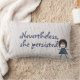 Stick Girl mit Brillen, kneipen Haaren und denim Kleid mit "nichtsdestotrotz beharrlich" Zitat auf pastellfarbenem Polka Punkt Hintergrund.