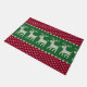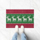 Es ist ein gewebter Pullover-Look - in einem Druck! Ein reich detailliertes Muster mit weißen Rentieren, die über ein grünes Feld ragen, umgeben von einem Weihnachtsrot mit weißen Verzierungen.
