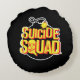 Das Logo der gelben und orangefarbenen Suizid-Squad in einer schwarzen Bombe auf weißem und schwarzem Hintergrund.