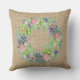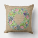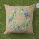 Mit diesem Kissen, das mit einem üppigen Kranz aus Sukkulenten, rosa, rot und pfirsichfarbenen Blume und Touchs aus lila Blattwerk geschmückt ist, können Sie Ihre Möbel erheben.
