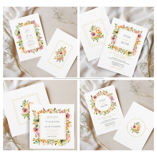 Die eleganten und fröhlichen, durchsichtigen Aquarelltöne in Rot, Gelb, Rost und leuchtend orangefarbenen und lebhaften Grüntönen erinnern an die Blüten des Sommergarten, wären aber zu jeder Jahreszeit perfekt für eine Hochzeit.