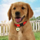 Zwei seitliche Hunde ID-Tag mit einem gelben kleinen Streifen Hintergrund auf der Vorderseite und ein Monogramm in Sans Serif Schriftart. Auf der Rückseite befinden sich der Hundename und die Telefonnummer des Besitzers mit dem gleichen Hintergrund.