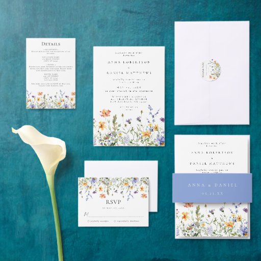 Dieses Design zeichnet sich durch eine Reihe von zarten Aquarellfarben-Wildblumen aus. Ideal für Hochzeiten im Sommer.