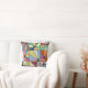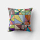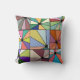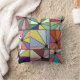 Dieses Kissen hat ein abstraktes Design, das aus neun Quadraten mit einem Kreis und "Strahlen" aus dem Kreis in vielen verschiedenen Farben besteht.