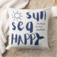 Fun, Strand Thema Baumwolle werfen Kissen zeigt "Sonne Meer glücklich" Typografie in nautischen Marine blau mit einem Wal-Schwanz, Ozeanwellen und Sonnenschein Doodles. Ideal für küstennahe und tropische Dekorationsstile und Zuhause.
