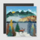 Eine wunderschöne Landschaft mit einzigartigen Farben und Texturen, die eine Berg- und Seenlandschaft und einen mehrfarbigen Wald mit aufsteigender Sonne und einem Elch in den Farben Blau, Grün, Gold und Magenta zeigen.