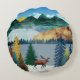 Eine wunderschöne Landschaft mit einzigartigen Farben und Texturen, die eine Berg- und Seenlandschaft und einen mehrfarbigen Wald mit aufsteigender Sonne und einem Elch in den Farben Blau, Grün, Gold und Magenta zeigen.