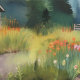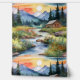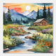 Atemberaubender Sonnenuntergang im Wasser hinter majestätischen Bergen, Laufen und Bollen mit Felsen und Kies, Waldkiefern, Blockhütte und wilde Blume.
