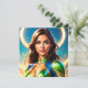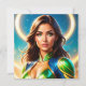 Digitales Kleinbild einer Science-Fiction/Fantasy-Heldin in einem dreiviertel Comic-Buch-Portrait. Sie hat auffallende grüne Augen und fließende Haare, die glänzende Smaragdgrün-goldene Rüstung tragen, gerahmt durch einen glühenden, kreisförmigen Halo vor einem aquamarinen, sternigen Hintergrund. Die kinematische Felgenbeleuchtung und die malerische Textur sorgen für Tiefe und Realismus. Als Puzzletext präsentiert - ideal für Superhelden, Zeichenkunst und Dekor im Pop-Kultur-Stil, aber auch für Produktanzeige, Plakate und Geschenke.