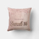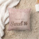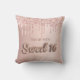 Ein Kissen für ein 16. Jähriges Mädchen Zimmer. Ein Imitat Rose goldener Hintergrund mit Imitaten Rose Gold und rosa Glitzer Tropfen, Farbe Tropfen aussehen. Der Text: Sweet 16 ist mit einem Schriftart im Ballonstil geschrieben, Skript. Personalisieren und einen Namen hinzufügen.