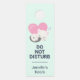 Türhänger mit einer bezaubernden grafischen Abbildung. Eine weiße Katze mit einem niedlichen Pfotenprint auf ihrem Fell. Schlafen friedlich. Ein großes rosa Herz hinter ihr und auch ein paar kleine Sterne. Minz grüner Hintergrund. Im Text steht: Nicht stören mit einem personalisierten Namen.
