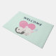 Begrüßungstürmatte mit einer bezaubernden Grafik. Eine weiße Katze mit einem niedlichen Pfotenprint auf ihrem Fell. Schlafen friedlich. Ein großes rosa Herz hinter ihr und auch ein paar kleine Sterne. Minz grüner Hintergrund.