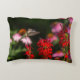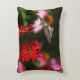 Ein Kolibri nähert sich einer Kardinal-Blume in einem lebendigen Garten. Der dunkelgrüne Hintergrund hebt die Blüten von Blume und Vogel hervor.