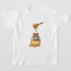 A sweet little brown bear peeks out from a glass honey jar, sitting cozily in a pool of golden honey with tiny paw pads showing. Above, a wooden honey dipper drips glossy honey in thick, shiny strands, creating a warm, candy-like look. Bold outlines, smooth highlights, and the big “HONEY” label give the illustration a bright, playful kawaii sticker style.